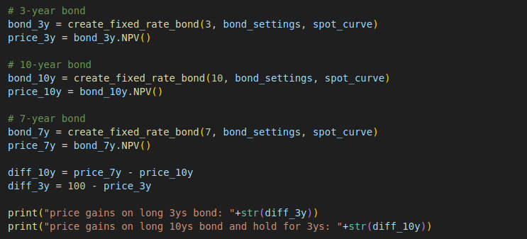 We created three QuantLib bond instances with the maturity of year 3, year 10 and year 7, and calling the NPV method to return the evaluated price of each. As the investment lengths for the two trading options are same, i.e. 3 years, the carry returns are some for them. Therefore, we only need to compare the price differences.