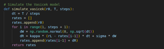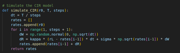 dR = kappa * (rL - rates[i-1]) * dt + sigma * np.sqrt(rates[i-1]) * dW