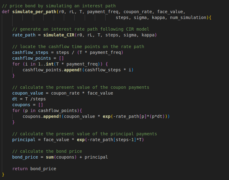 Once we have the function to calculate the bond price for a single simulated interest rate path, we can then call the function repeatedly to simulate enough paths to achieve acceptable accuracy, and calculate the bond price by averaging the prices from all paths.