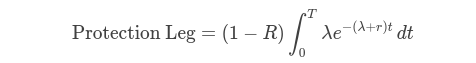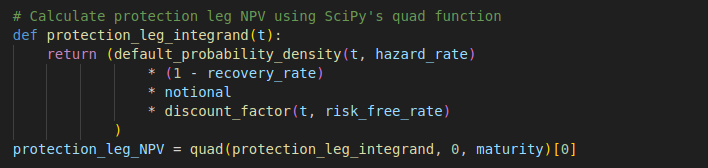 The protection leg represents the present value of the expected payout by the protection seller in the event of a default. It can be calculated by integrating the expected loss over time, weighted by the probability of default and discounted to present value. The scipy.integrate.quad method is used here to help performing numerical integration of the integrand for the CDS contract period.
