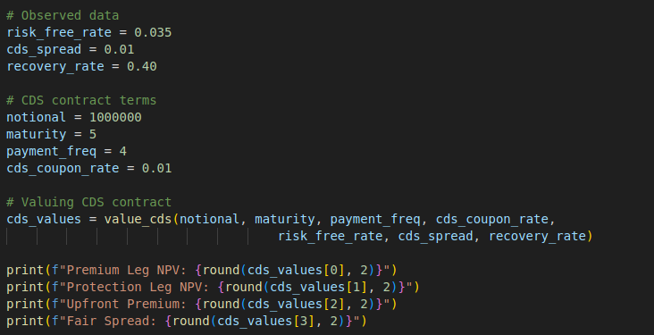 I have created a value_cds function that takes these inputs and outputs the upfront premium, fair spread, premium leg NPV, and protection leg NPV. The main task for this blog post is to implement the value_cds function.