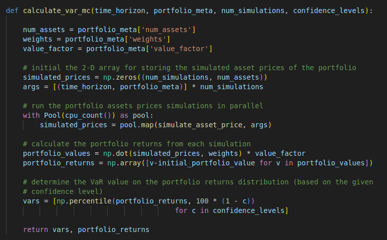 def calculate_var_mc(time_horizon, portfolio_meta, num_simulations, confidence_levels):