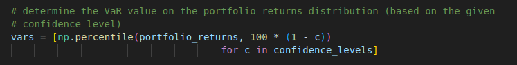 From step 3, we have the expected portfolio returns from the list of simulated portfolio scenarios. We can use the np.percentile function to identify the loss threshold corresponding to the specified confidence levels, such as 1%, 5%, and 16%.
