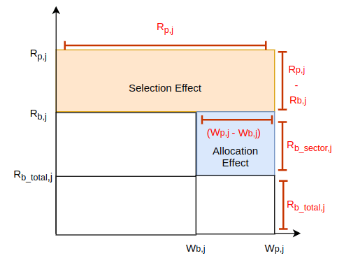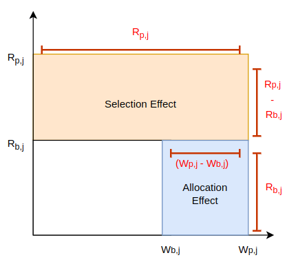 The Rp,j denotes the portfolio returns, while Rb,j denotes the Benchmark returns. Wb,j denotes the benchmark weight in the sector or asset class. We can also identify the selection effect in the yellow area of the diagram above.