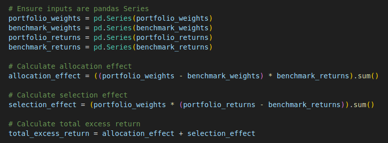 selection_effect = (portfolio_weights * (portfolio_returns - benchmark_returns)).sum()