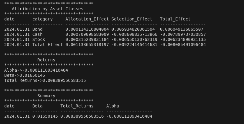 To demonstrate how the function is configured and its output, I created two examples: one for a single-period evaluation using the BF model, and another for a multi-period evaluation using the BHB model that also incorporates industry attribution. The code for generating the sample data and the function executing can be found at bottom of this page.