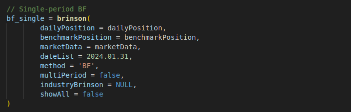 To demonstrate how the function is configured and its output, I created two examples: one for a single-period evaluation using the BF model, and another for a multi-period evaluation using the BHB model that also incorporates industry attribution. The code for generating the sample data and the function executing can be found at bottom of this page.